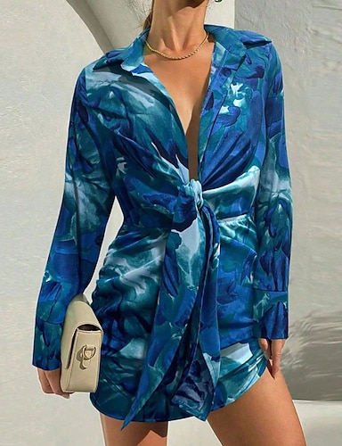 Damskie Sukienka mini Sukienka koszulowa Sukienka z nadrukiem Elegancja Moda Nowoczesny Codzienny Wyjściowe Weekend Regularny Graficzny Długi rękaw W serek Niebieski Zielony Wiosna Jesień Zima