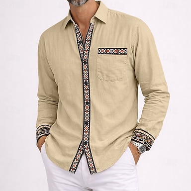 Męskie Koszula Koszula lniana Letnia koszula Koszula plażowa Koszula w stylu vintage Zapinana na guziki koszula Jednokolorowe Codzienny Urlop Khaki Długi rękaw Wieczorne Lato Wiosna Odzież Naszyte