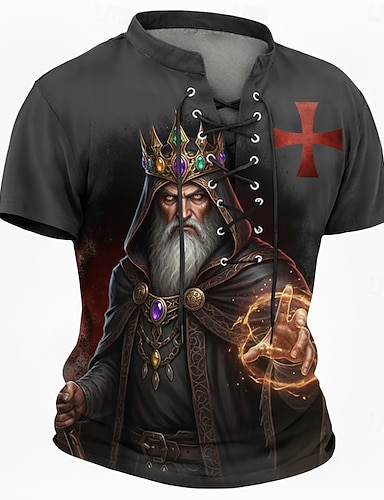 Męska Krucjaty Średniowieczny Król Czarodziej Złota Korona Magiczna Energia Czerwony Krzyż Templariuszy Fantastyka Gotycka Retro Wojownik Lace Up T-shirt Wydruki na Całej Powierzchni Henley V Szyja
