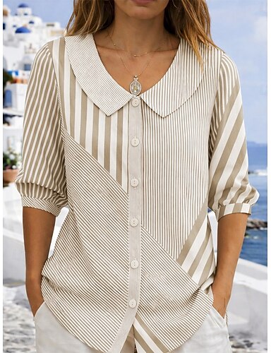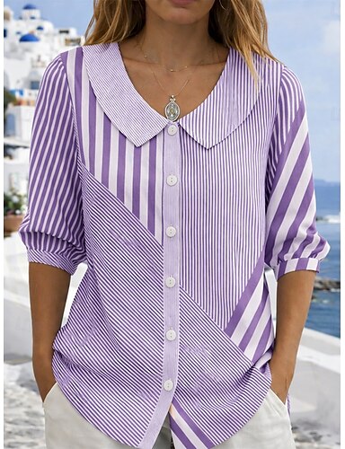 Damskie Bluzka Guziki Nadruk Graficzny Prążki Zabytkowe Elegancki Codzienny Rękaw 3/4 Kołnierzyk Piotruś Pan Zwykłe topy Codzienny Praca Święto Niebieski Fioletowy Zielony Khaki Lato Wiosna