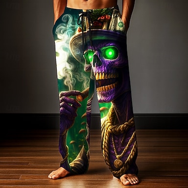Spodnie męskie z czaszką luźne casualowe średni stan styl gothic wakacyjne elastyczny pas z troczkami spodnie przypominające len z kieszeniami wiosna jesień 3D druk ciemnozielone zielone