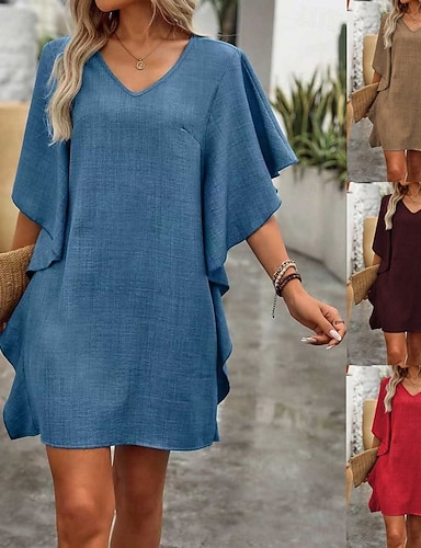 Damskie Sukienka mini Sukienka trapezowa Codzienny Codzienny Luźna Równina Rękaw 1/2 W serek Niebieski Czarny Wino Czerwony Lato Wiosna Jesień