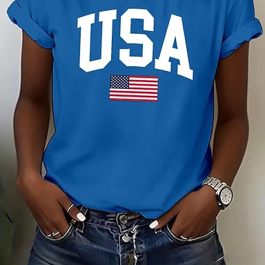 Amerykański Dzień Niepodległości Damskie Podkoszulek Koszulka Nadruk Graficzny Flaga Elegancki Klasyczny Codzienny Krótki rękaw Półgolf Zwykłe topy Codzienny Wyjściowe Niebieski Czerwony Lato Wiosna