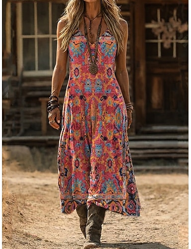 Damskie Sukienka midi Sukienka Boho Zabytkowa sukienka Codzienne sukienki Zabytkowe Flowy Regularny Boho Kwiaty Graficzny Bez rękawów W serek Czerwony Fioletowy Pomarańczowy Lato Wiosna