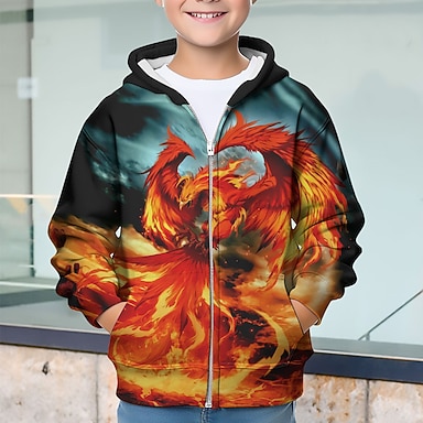 Dla chłopców 3D ogień Bluza z Kapturem Płaszcz Odzież wierzchnia Długi rękaw Druk 3D Jesień Zima Moda Moda miejska Nowoczesne Poliester Dzieci 3-12 lat Suwak Kaptur Na zewnątrz Codzienny Regularny