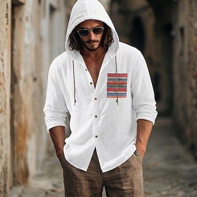 Męskie Koszula Koszula lniana Letnia koszula Koszula plażowa Zapinana na guziki koszula Bluza z kapturem Boho Codzienny Urlop Biały Długi rękaw Kaptur Lato Wiosna Odzież Niejednolita całość