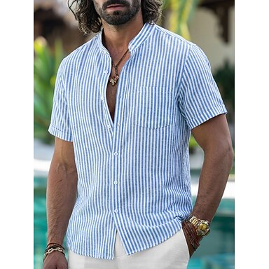 Męskie Koszula Koszula lniana Letnia koszula Koszula plażowa Pionowe paski Codzienny Streetwear Niebieski Rumiany róż Krótki rękaw Kołnierzyk chiński Lato Wiosna Odzież