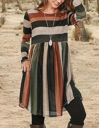 Damskie Sukienka mini Sukienka A line Codzienny Codzienny Luźna Prążki Długi rękaw Karbowana szyja Brązowy Wiosna Jesień