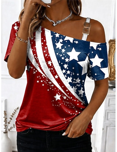 Amerykański Dzień Niepodległości Damskie Podkoszulek Koszulka Nadruk Graficzny Elegancki Klasyczny Codzienny Krótki rękaw Asymetryczna szyja Zwykłe topy Codzienny Wyjściowe Weekend Niebieski Czerwony