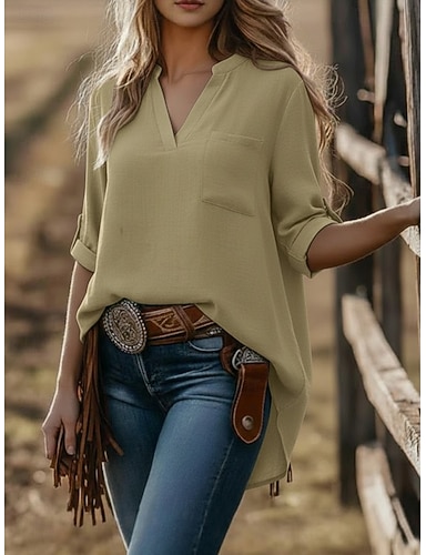 Damskie Koszule bawełniane lniane Letnie szczyty Bluzka Eleganckie topy Z marszczeniami Niejednolita całość Kieszeń Jednokolorowe Równina Elegancja Zabytkowe damska Rękaw 3/4 Kołnierzyk koszuli