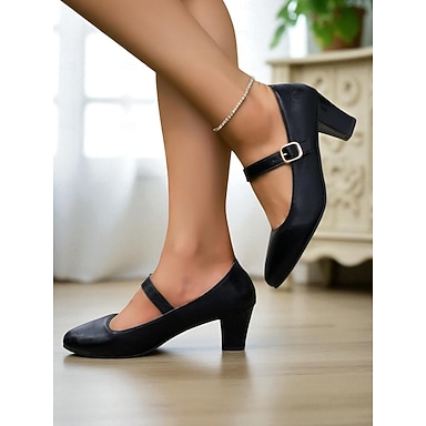 Klasyczne czarne czółenka typu „maryn jane” z lat 50. XX wieku z paskiem na kostce, eleganckie buty na klockowym obcasie do biura, na imprezy i na co dzień