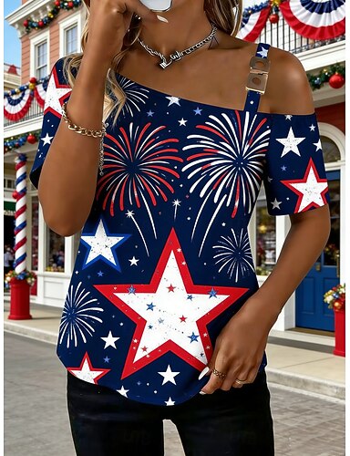 Amerykański Dzień Niepodległości Damskie Podkoszulek Koszulka Nadruk Graficzny Gwiazda Moda Elegancki Klasyczny Krótki rękaw Na jedno ramię Zwykłe topy Codzienny Wyjściowe Weekend Niebieski Lato