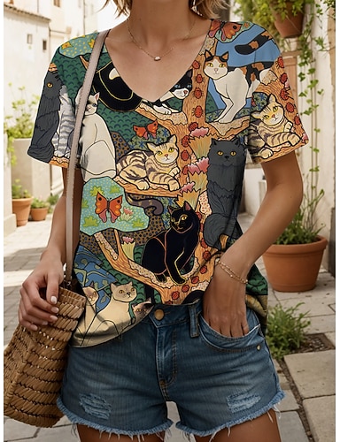 Damskie Podkoszulek Nadruk Graficzny Zwierzę Kot Zabytkowe Elegancki Klasyczny Krótki rękaw W serek Zwykłe topy Codzienny Niebieski Żółty Rumiany róż Fioletowy Pomarańczowy Lato Wiosna
