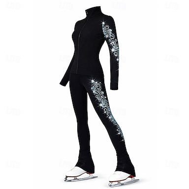 Kurtka do jazdy figurowej ze spodniami, damska, dziewczęca, do jazdy na łyżwach, czarna, elastyczna, treningowa, do zawodów, termiczna, ciepła, z kryształkami / strasami, z długim rękawem, do jazdy