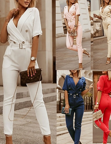 Damskie Kombinezon Aktywny Jednokolorowe Rękaw 1/2 W serek Kieszeń Guziki Urlop Praca Regularny Niebieski Biały Rumiany róż Wiosna