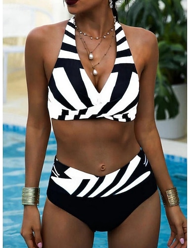 Kostium kąpielowy tankini damski 2-częściowy z szortami kontrola brzucha wysoki stan elegancki bez pleców wakacyjny strój plażowy geometryczne paski dekolt halter bez rękawów