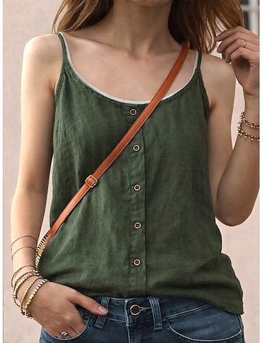 Damskie Podkoszulek Sztuczna bawełna len Koszulka Guziki Równina Moda Elegancki Klasyczny Bez rękawów Paski Zwykłe topy Codzienny Wyjściowe Weekend Zielony Lato Wiosna