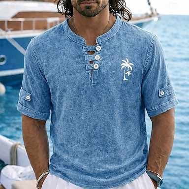 Męskie Koszulki polo Koszula ze 100% bawełny Acid Wash Codzienny Święto Bez kołnierza Krótki rękaw Moda Podstawowy Drzewo palmowe Guziki Postarzane Lato Wiosna Niebieski Czerwony Fioletowy Zielony