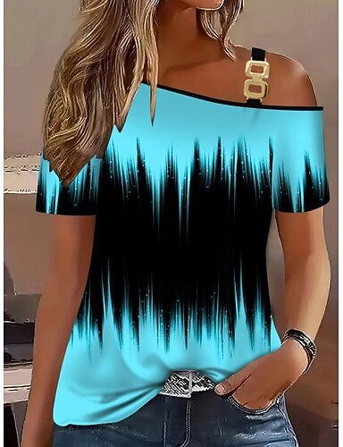 Damskie Podkoszulek Koszulka Nadruk Kwiaty Graficzny Zabytkowe Elegancki Klasyczny Krótki rękaw Asymetryczna szyja Długie topy Codzienny Wyjściowe Weekend Niebieski Biały Lato Wiosna