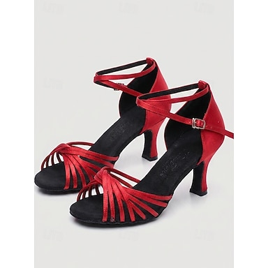 Damskie czerwone satynowe szpilki do tańca latynoskiego – buty do salsy z odkrytymi palcami i paskiem na krzyż, profesjonalne do ćwiczeń & wydajność