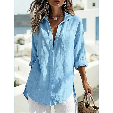 Damskie Koszula Koszule bawełniane lniane Koszula plażowa Zapinana na guziki koszula Niejednolita całość Kieszeń Jednokolorowe Równina Urlop Moda Codzienny Krótki rękaw Wieczorne Zwykłe topy