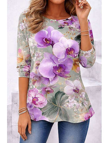 Damskie Podkoszulek Nadruk Kwiaty Graficzny Rośliny Elegancki Klasyczny Nowoczesny Długi rękaw Półgolf Zwykłe topy Codzienny Weekend Ubrania wakacyjne Niebieski Rumiany róż Zielony Lato Wiosna Jesień