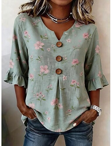 Damskie Koszula Nadruk Ombre Kwiaty Graficzny Bohema Zabytkowe Codzienny Rękaw 3/4 W serek Zwykłe topy Codzienny Święto Stroje plażowe Niebieski Zielony trawiasty Rumiany róż Królewski błękit