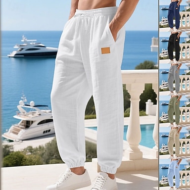 Męskie Lniane spodnie Spodnie Letnie spodnie Spodnie z gazy Ściągana na sznurek Elastyczny pas Prosta noga Równina Komfort Oddychający Pełna długość Codzienny Na zewnątrz Plaża Urlop Moda Biały