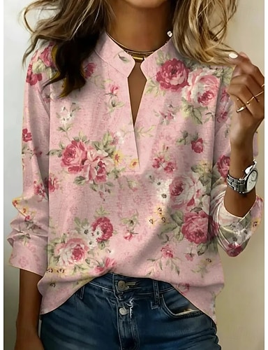 Damskie Koszula Kwiaty Graficzny Zabytkowe Elegancki Długi rękaw W serek Długie topy Codzienny Święto Wyjściowe Rumiany róż Fioletowy Beżowy Lato Wiosna