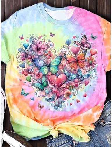 Damskie Podkoszulek Nadruk Graficzny Motyl Wzór tie-dye Zabytkowe Elegancki Klasyczny Krótki rękaw Półgolf Zwykłe topy Codzienny Niebieski Rumiany róż Tęczowy Lato Wiosna