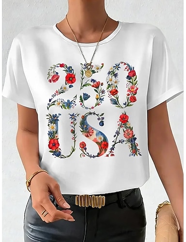 Amerykański Dzień Niepodległości Damskie Podkoszulek Nadruk Kwiaty Graficzny Flaga Elegancki Klasyczny Codzienny Krótki rękaw Półgolf Okrągły dekolt Zwykłe topy Codzienny Niebieski Czarny Biały
