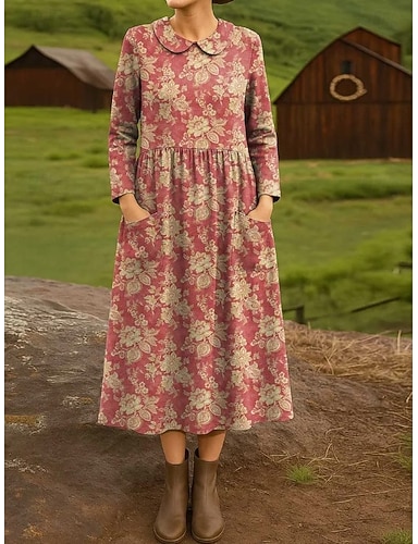 Damskie Sukienka midi Sukienka ołówkowa Plisowana sukienka Urlop Codzienny Boho Święto Wiosenna sukienka Regularny Kwiaty Graficzny Długi rękaw Półgolf Szary różowy Pomarańczowy Wiosna Jesień Zima