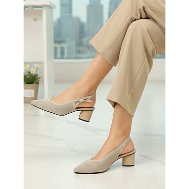 Damskie beżowe, dzianinowe czółenka typu slingback z noskiem w szpic i kokardą – wygodne, oddychające buty na średnim obcasie blokowym do codziennych dojazdów do pracy i pracy w biurze &profesjonalne