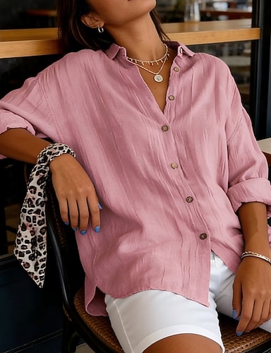 Wiosenna koszula z lnu dla kobiet przypominająca bawełniany len casualowa plażowa z guzikami gładka stylowa podstawowa z długim rękawem z kołnierzykiem regularne góry codzienne na wakacje różowa