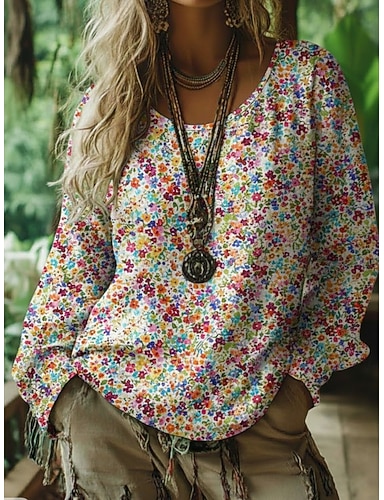 Damskie Koszula Boho Koszulka w stylu boho Podkoszulek Koszulka Nadruk Kwiaty Zabytkowe Etniczne Codzienny Długi rękaw Półgolf Zwykłe topy Codzienny Weekend Ubrania wakacyjne Rumiany róż Lato Wiosna