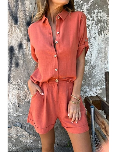 Damskie Zestawy spodenek Sztuczna bawełna len Rękaw 1/2 Kołnierzyk koszuli Jednokolorowe Elegancja Moda Moda miejska Codzienny Na zewnątrz Niebieski Czarny Biały Lato Regularny