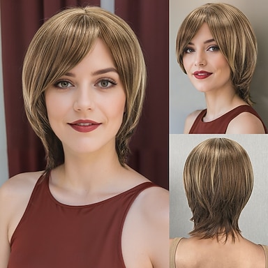 Peruki syntetyczne Falowana Kinky Straight Krótki Bob Fryzura cieniowana Z grzywką Tkany maszynowo Peruka 10" Jasnobrązowy Włosie synetyczne Męskie Klasyczny Wygodny Przejście kolorów Wielokolorowy