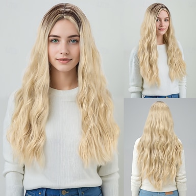 Peruki syntetyczne Uniformy Zawody Księżniczka Kręcone Falowana Przedziałek na środku Fryzura cieniowana Tkany maszynowo Peruka 26 cali Jasne złoto Włosie synetyczne Damskie Cosplay Impreza Moda