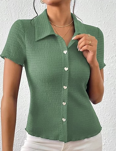 Damskie Codzienna koszula Zapinana na guziki koszula Bluzka Z marszczeniami Guziki Jednokolorowe Codzienny Elegancki Krótki rękaw Kołnierz polo Zwykłe topy Codzienny Święto Stroje plażowe Zielony