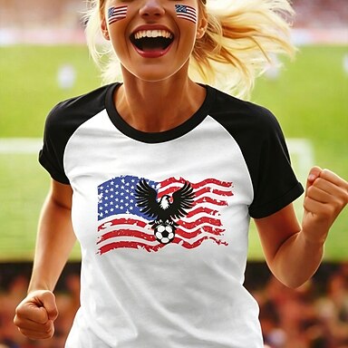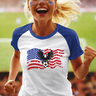 Koszulka piłkarska damska z nadrukiem, grafika, vintage, stylowa, swobodna, krótki rękaw, dekolt w serek, regularna, codzienna, weekendowa, niebieska, czarna, biała, czerwona, letnia, wiosenna