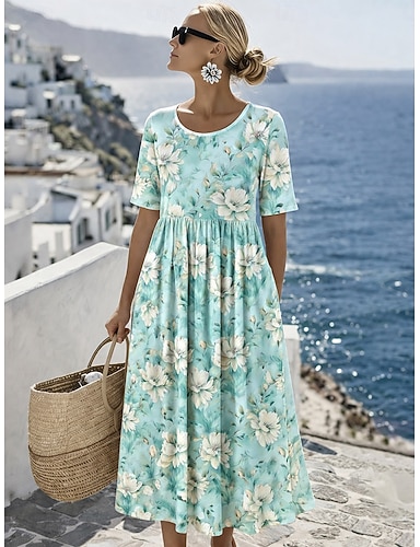 Damskie Sukienka midi Sukienka trapezowa Urlop Codzienny Święto Luźna Kwiaty Graficzny Krótki rękaw Półgolf Niebieski Rumiany róż Fioletowy Zielony Lato Wiosna