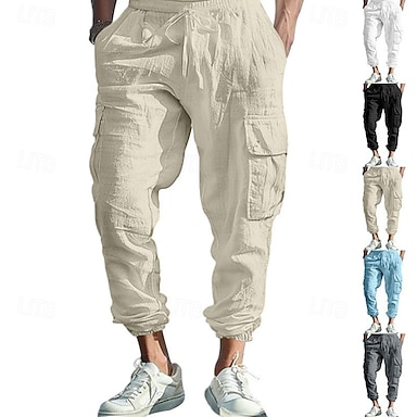 Męskie Spodnie cargo Lniane spodnie Spodnie Letnie spodnie Ściągana na sznurek Elastyczny pas Multi Pocket Równina Komfort Oddychający Pełna długość Codzienny Święto Urlop Moda Czarny Biały Elastyczny