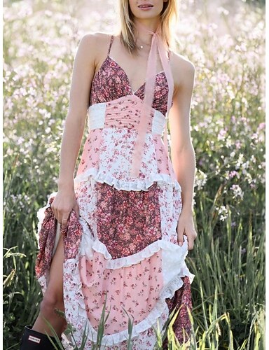 Damskie Sukienka maxi Codzienne sukienki Sukienka w kwiatki Sukienka Boho Moda Nowoczesny Na zewnątrz Urlop Wyjściowe Regularny Kwiaty Bez rękawów W serek Niebieski Czerwony Fioletowy Lato Wiosna