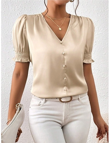 Damskie Koszula Bluzka Guziki Równina Elegancki Klasyczny Nowoczesny Krótki rękaw W serek Zwykłe topy Codzienny Święto Wyjściowe Niebieski Czarny Biały Jasnozielony Rumiany róż Lato Wiosna