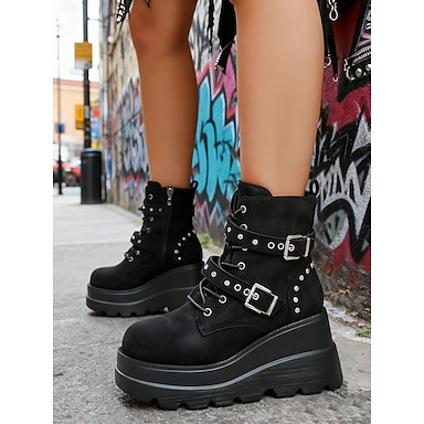 Damskie czarne punkowe buty motocyklowe z ćwiekami i klamrami na paskach - sznurowane, masywne buty na platformie, idealne na co dzień, do noszenia na mieście i w stylu rockowym