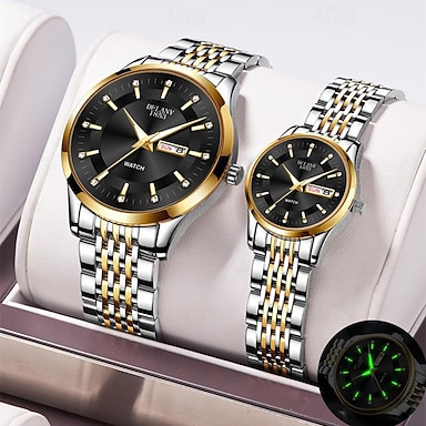 Dwa nowe, modne, biznesowe zegarki kwarcowe dla par - koperta ze stali nierdzewnej, wodoodporność IPX7, luminescencyjny podwójny kalendarz z datą i wyświetlaczem niedziela/poniedziałek, pasek ze stopu