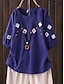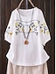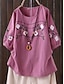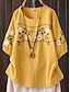 Koszula z lnu przypominającego sztuczny bawełniany len haftowane kwiaty vintage casual rękaw 3/4 okrągły dekolt regularne bluzki codzienne biały żółty granatowy fioletowy lato wiosna jesień
