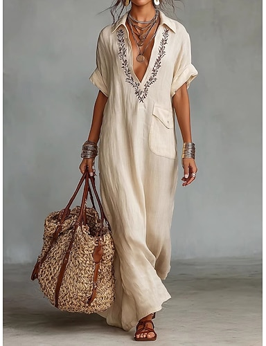 Damskie Sukienka maxi Sztuczna bawełna len Sukienka trapezowa Sukienka koszulowa Codzienne sukienki Codzienne Codzienny Styl uliczny Codzienny Urlop Weekend Luźna Równina Krótki rękaw Kołnierzyk