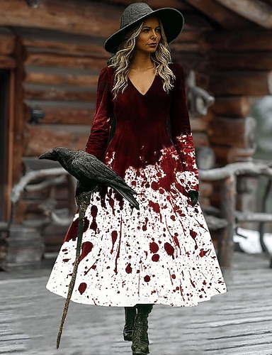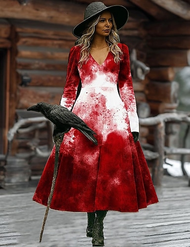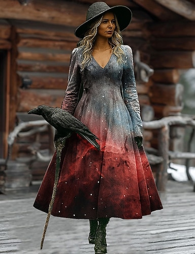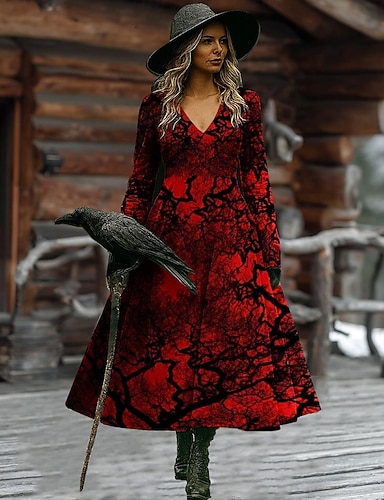 Sukienka midi z nadrukiem czarownicy damska w kształcie litery A wakacyjna codzienna regularny fason kwiatowy graficzny Hocus Pocus długi rękaw w szpic czarny czerwony brązowy wiosna jesień