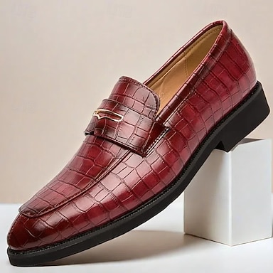 męskie czerwone mokasyny z wytłoczonym wzorem imitującym skórę krokodyla, wsuwane, codzienne buty wizytowe, mokasyny z metalowymi wstawkami, idealne na co dzień, w podróż, na imprezy, do biura, na weekendowe wyjścia i do eleganckiego, casualowego stylu